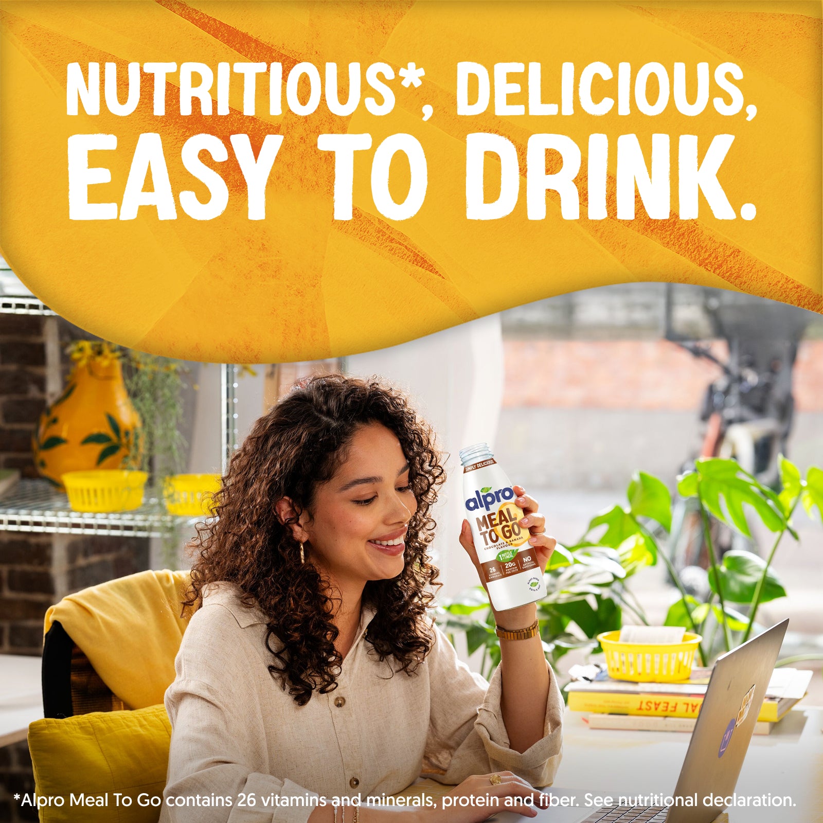 *Alpro Meal to Go bevat 26 vitaminen en mineralen, eiwitten en vezels. Zie de voedingswaarden.